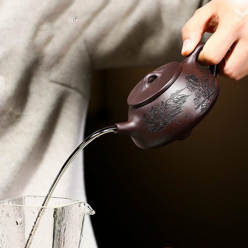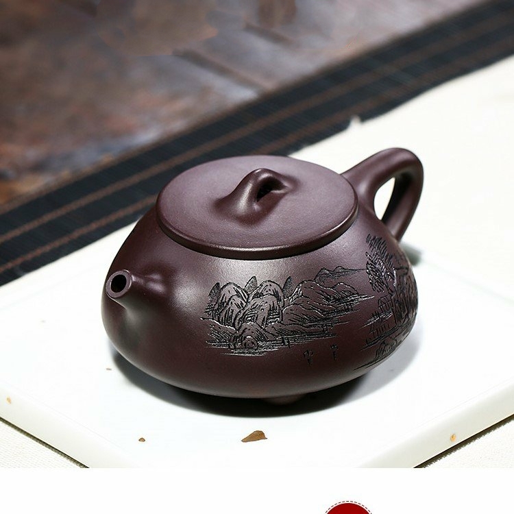 Bộ Ấm Chén Thạch Biều Cảnh Chu Kim Sa, Tử Sa Nguyên Khoáng, Thủ Công 230ml