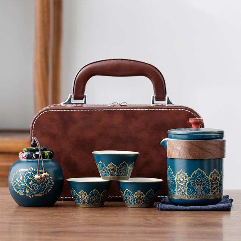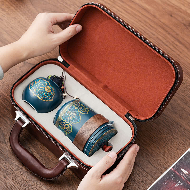 Bộ Ấm Trà Gốm Du Lịch Di Động – Với thiết kế hoa văn tinh tế và bao bì túi da sang trọng, bộ ấm trà này không chỉ là một sản phẩm dùng để pha trà mà còn là một tác phẩm nghệ thuật mang đậm dấu ấn thanh lịch.