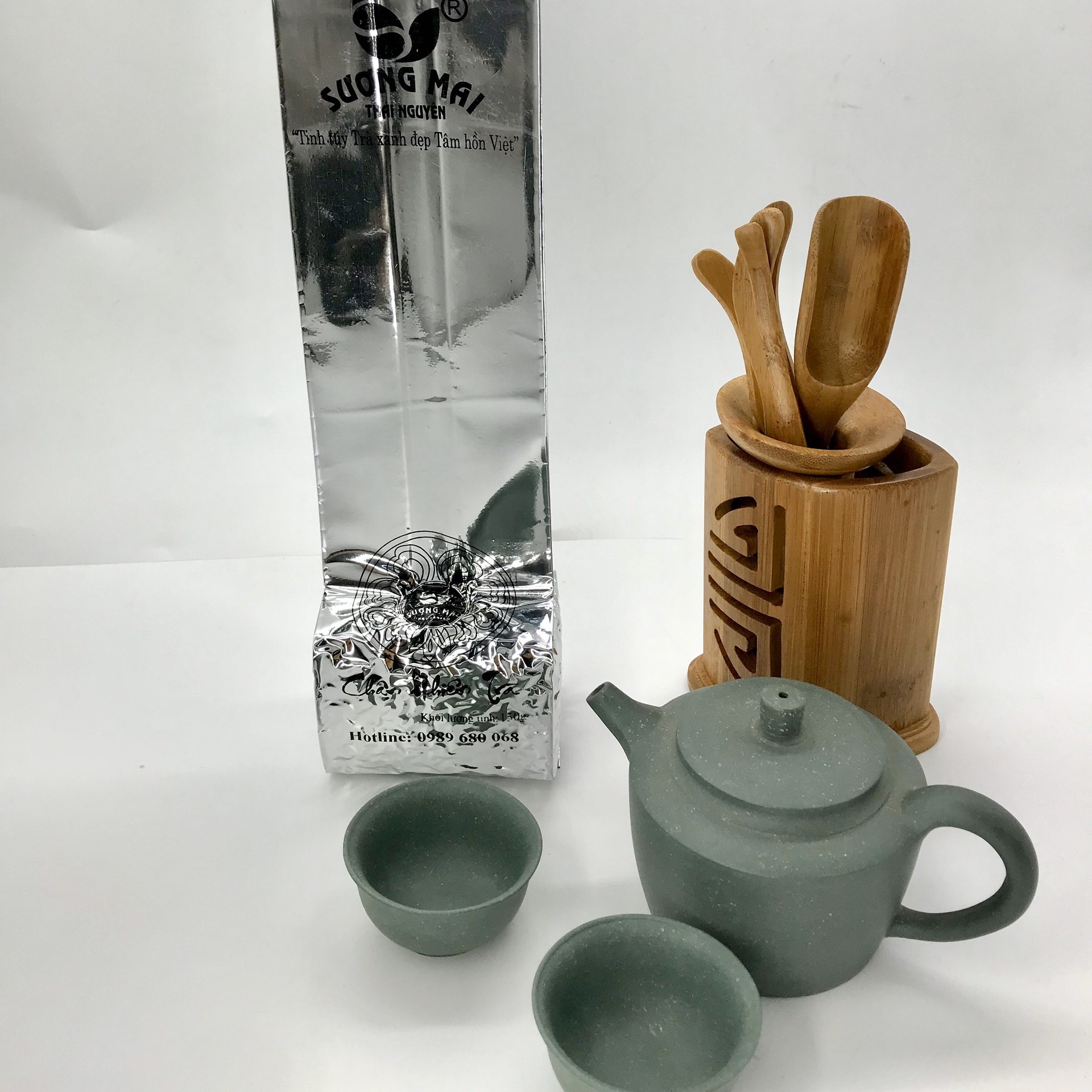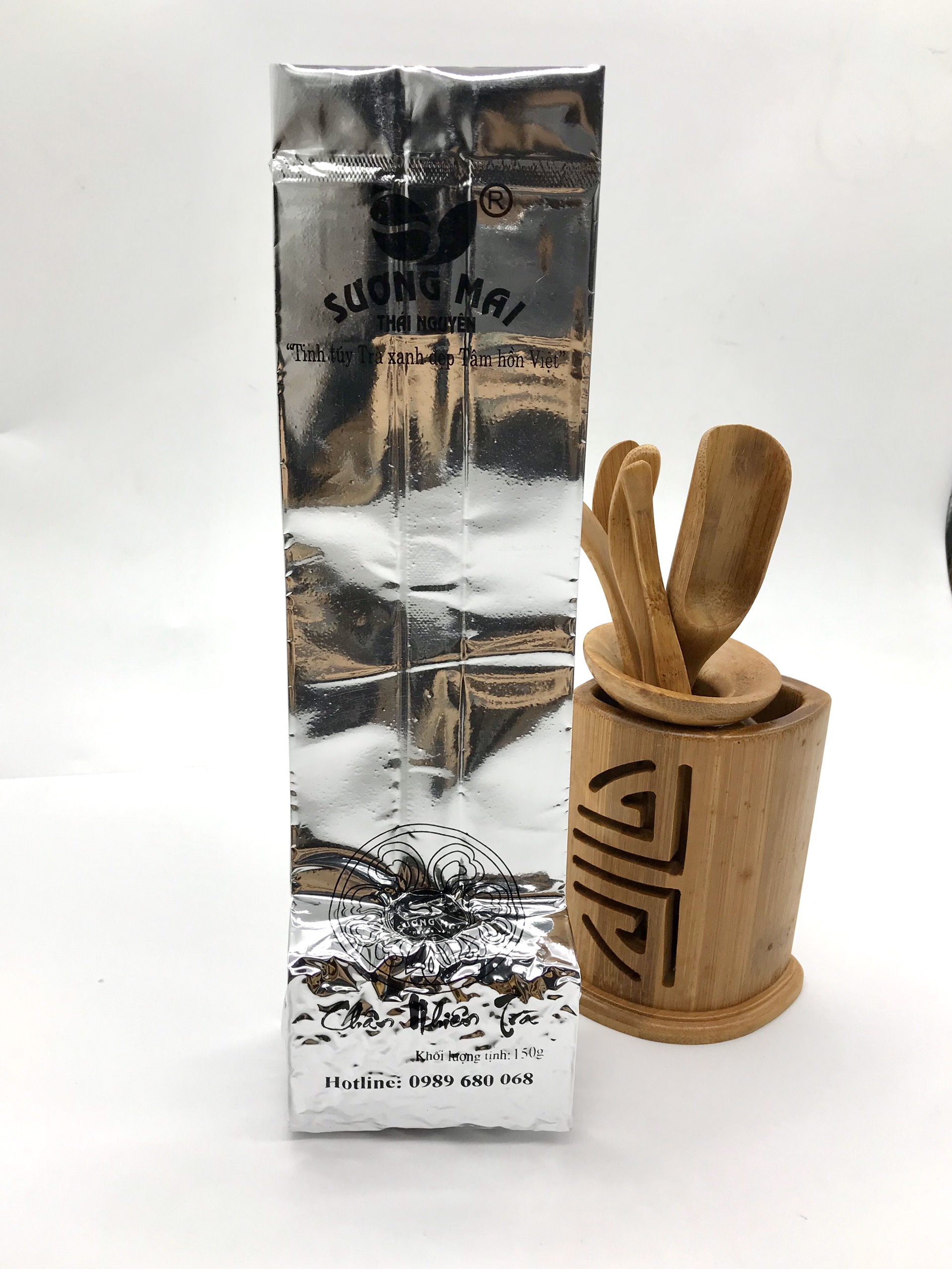Hộp đựng Trà: Hộp thiếc hoặc hộp gốm với chế tác tinh xảo được đặt hàng riêng cho Trà Việt Sương Mai, với các đường nét hóa rồng và hoa văn thể hiện văn hóa Việt Nam