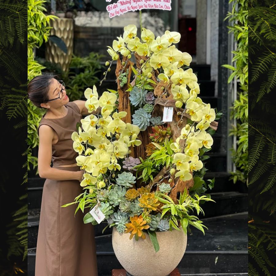 Chậu Gỗ Lũa Hồ Điệp Vàng Trồng Với Sen Đá – Quà Mừng Khai Trương Độc Lạ