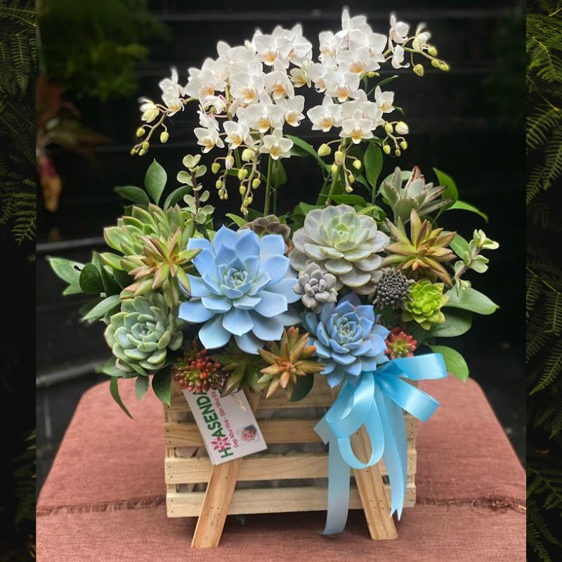 Chậu Lan Hồ Điệp Mini Trắng Ghép Sen Đá Xanh, Hoa Lan Hồ Điệp Để Bàn, Hoa Sinh Nhật Đẹp