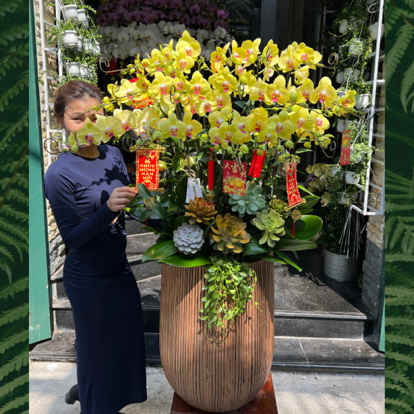 Chậu Lan Khai Trương Vàng Rực Rỡ Mix Sen Đá Decor Đại Cát Đại Lợi
