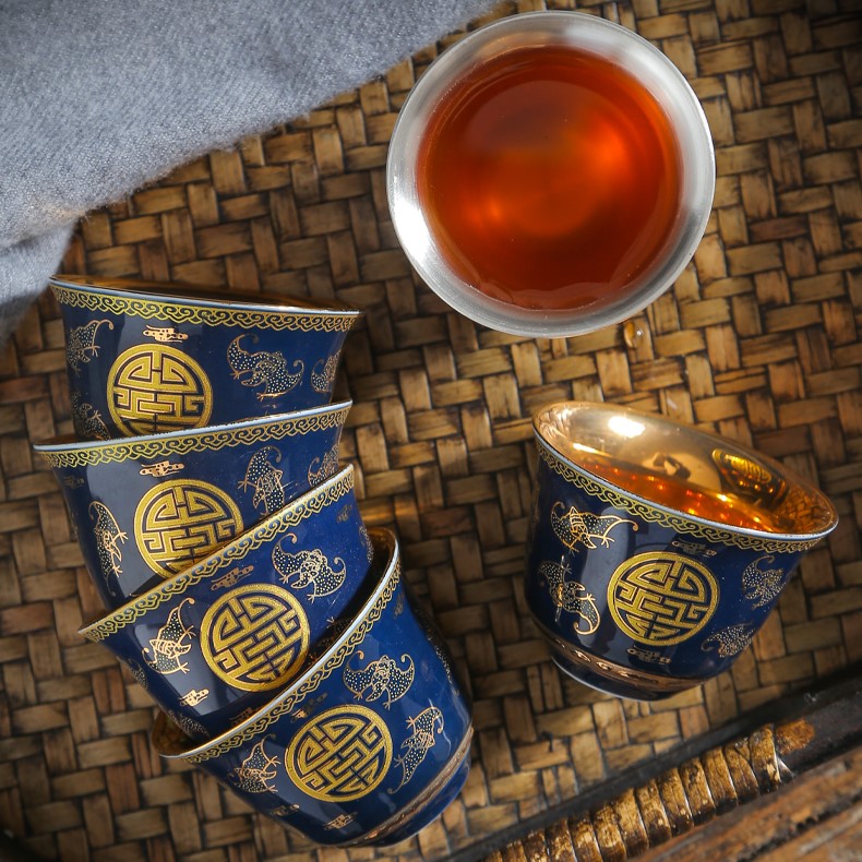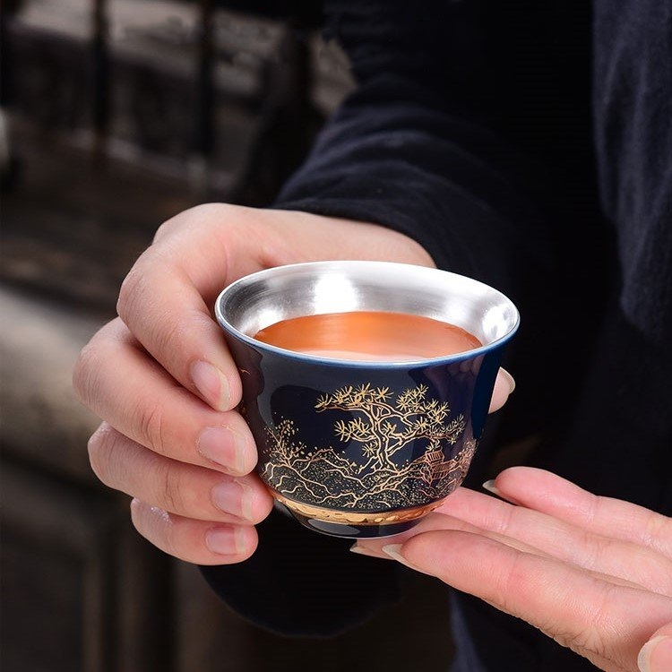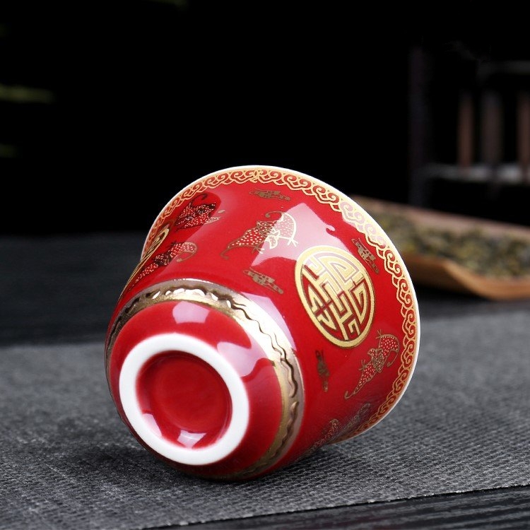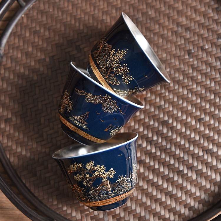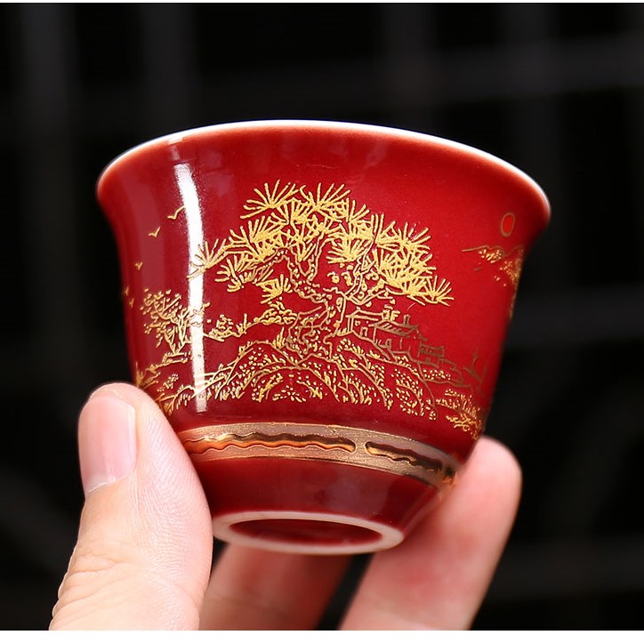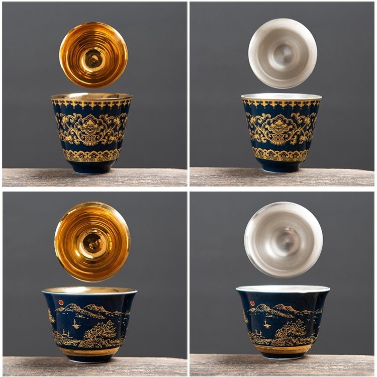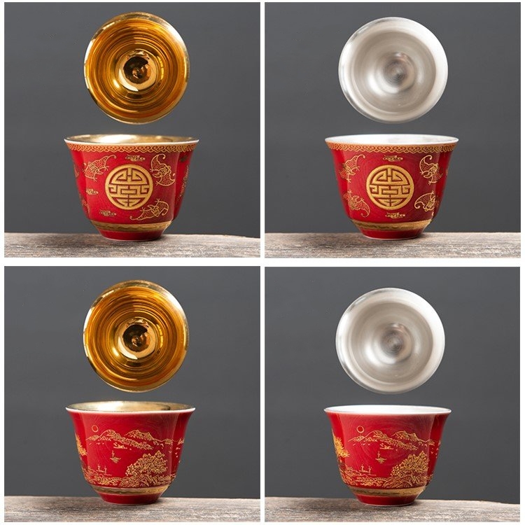 Chén trà Dương Phúc Đoàn Viên được là từ bạc 99,99% bên ngoài được bọc gốm tinh tế sang trọng họa tiết hoa văn màu đỏ vàng chế tác thủ công từ bạc 99,99% bởi thợ kim hoàn nổi tiếng nhất vùng Đại lý