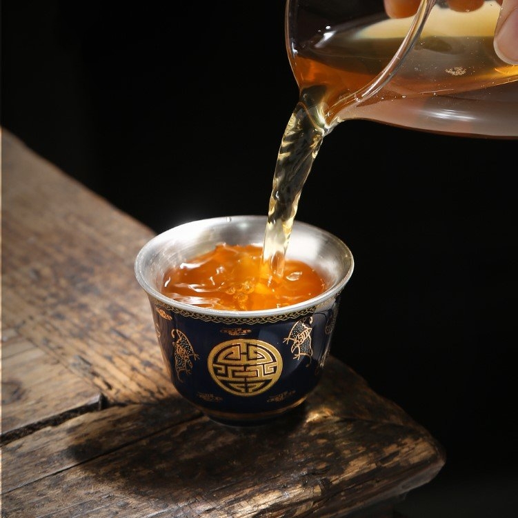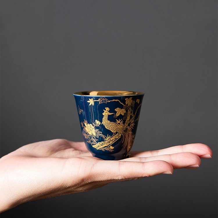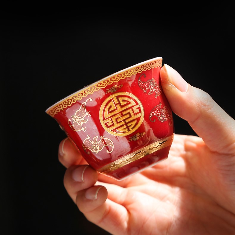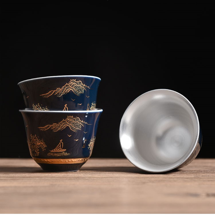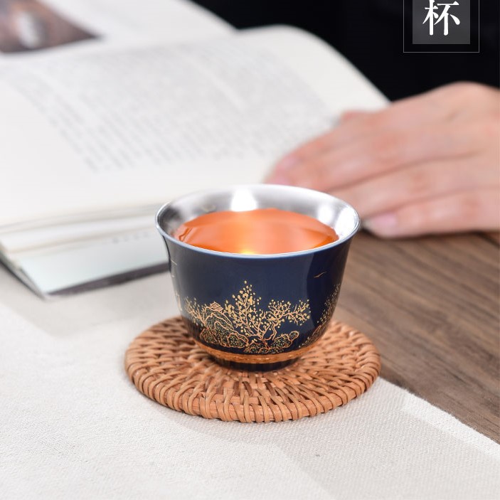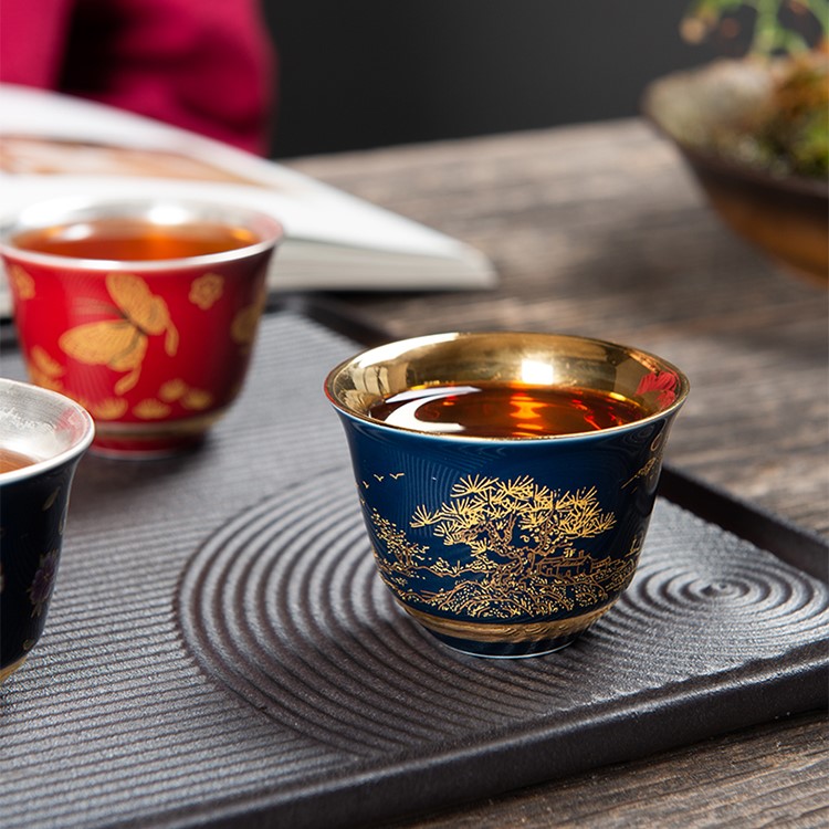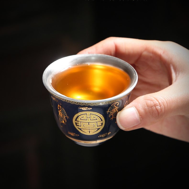 Chén trà Dương Phúc Đoàn Viên được là từ bạc 99,99% bên ngoài được bọc gốm tinh tế sang trọng họa tiết hoa văn màu đỏ vàng chế tác thủ công từ bạc 99,99% bởi thợ kim hoàn nổi tiếng nhất vùng Đại lý