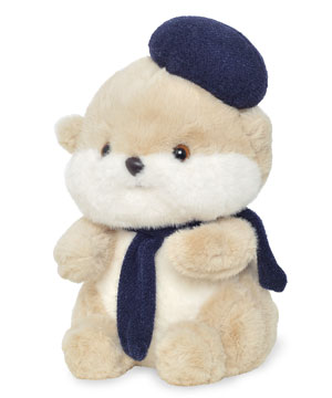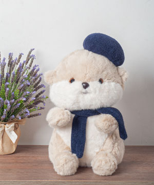 Với chiếc mũ nồi xinh xắn và khăn choàng xanh đậm, chú rái cá bông này như bước ra từ một góc phố nghệ thuật ở Paris. Dáng ngồi mũm mĩm, đôi mắt tròn ngơ ngác và bộ lông nhung mịn khiến ai nhìn cũng muốn ôm một cái thật chặt.