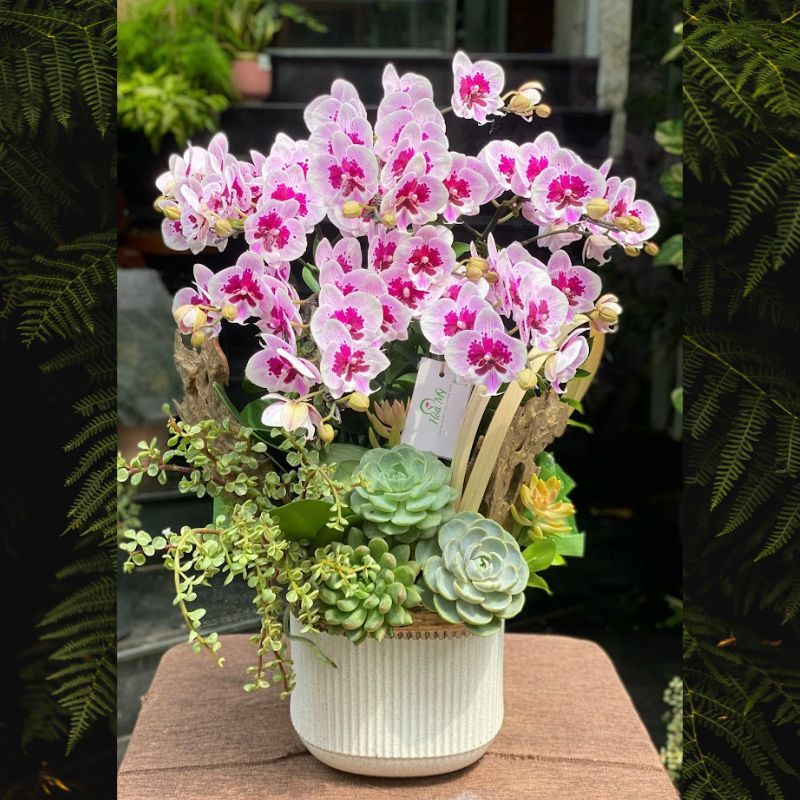 Ho Diep Mini Để Bàn – Chậu Tiểu Hồ Điệp Đốm Hồng Trang Trí Gỗ Lũa Và Sen Đá Độc Đáo