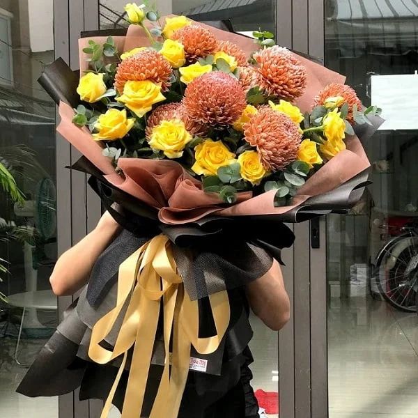 Hoa Cúc Mẫu Đơn Nâu Socola Mix Với Hoa Hồng Vàng