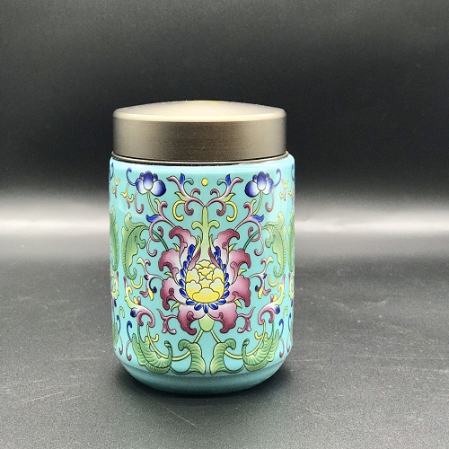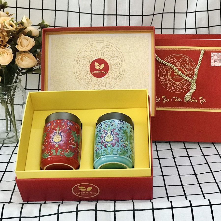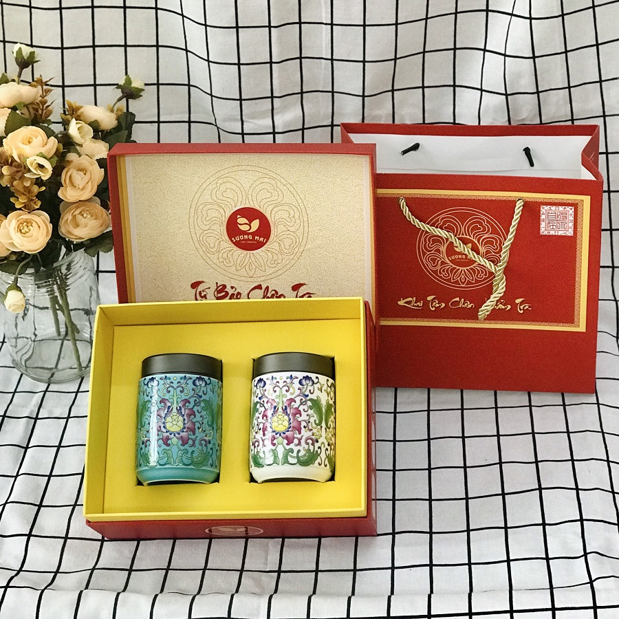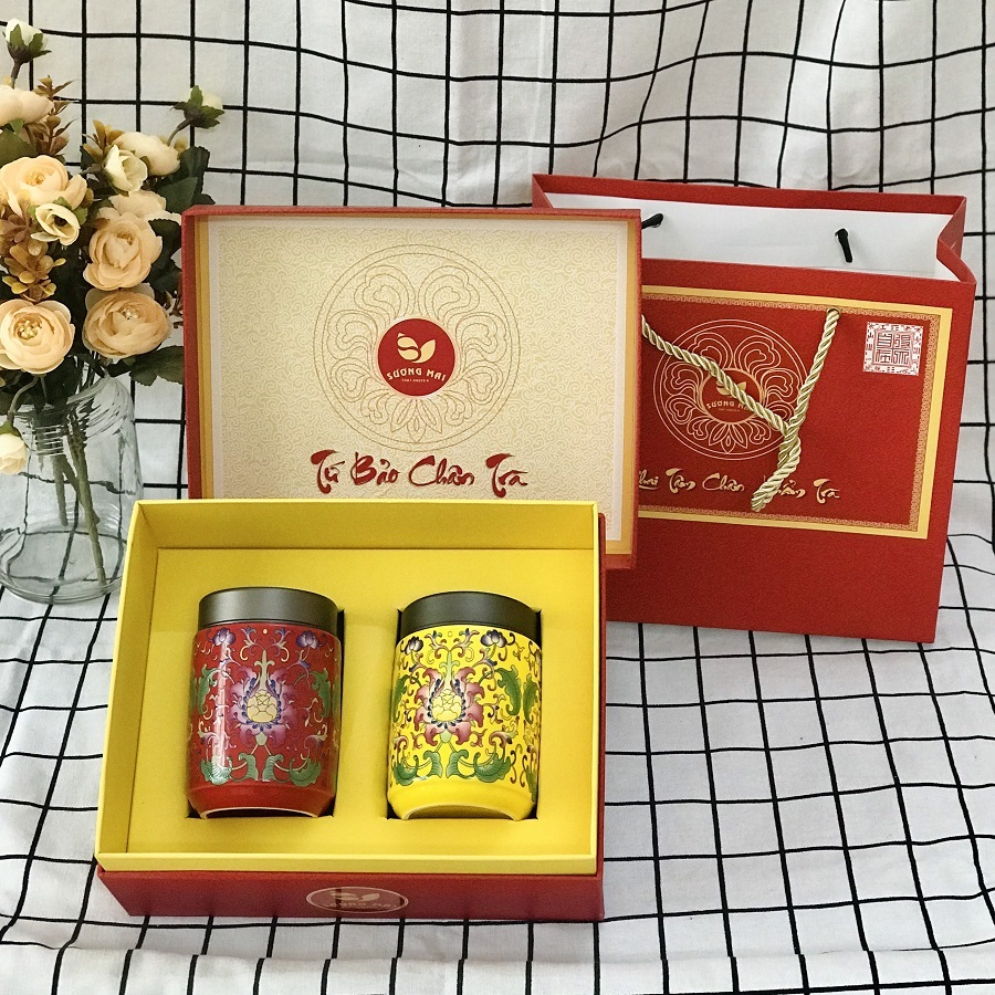 1 lọ trà bằng gốm pháp lam cực đẹp, bên trong là trà cực phẩm năm trong bộ Tứ Bảo Chân Trà có các màu đỏ, xanh, vàng, trắng để quý trà lựa chọn màu phù hợp với phong thủy.