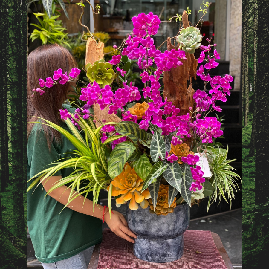 Lan Hồ Điệp Mini Tím Mix Sen Đá Decor Với Lũa Gỗ Cao Cấp Tự Nhiên