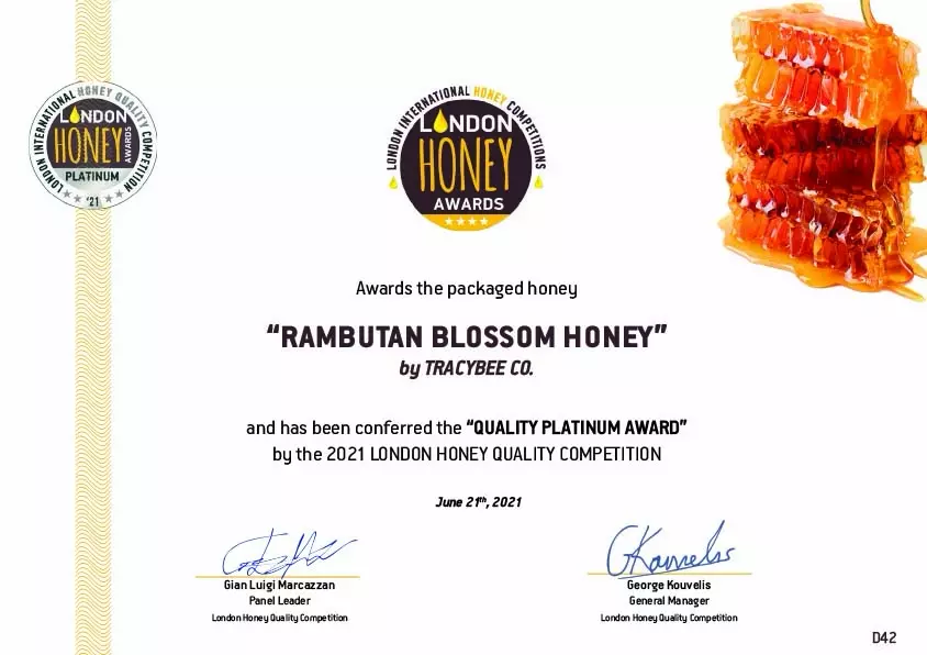 Lý do khiến sự đặc biệt của mật ong hoa chôm chôm Tracybee tăng thêm phần thuyết phục bởi đây là sản phẩm mật ong Việt Nam đầu tiên đạt giải Platinum – giải thưởng cao nhất tại London Honey Awards 2021 (Anh), cuộc thi vinh danh về chất lượng và hương vị của tất cả các loại mật ong đến từ khắp nơi trên thế giới.