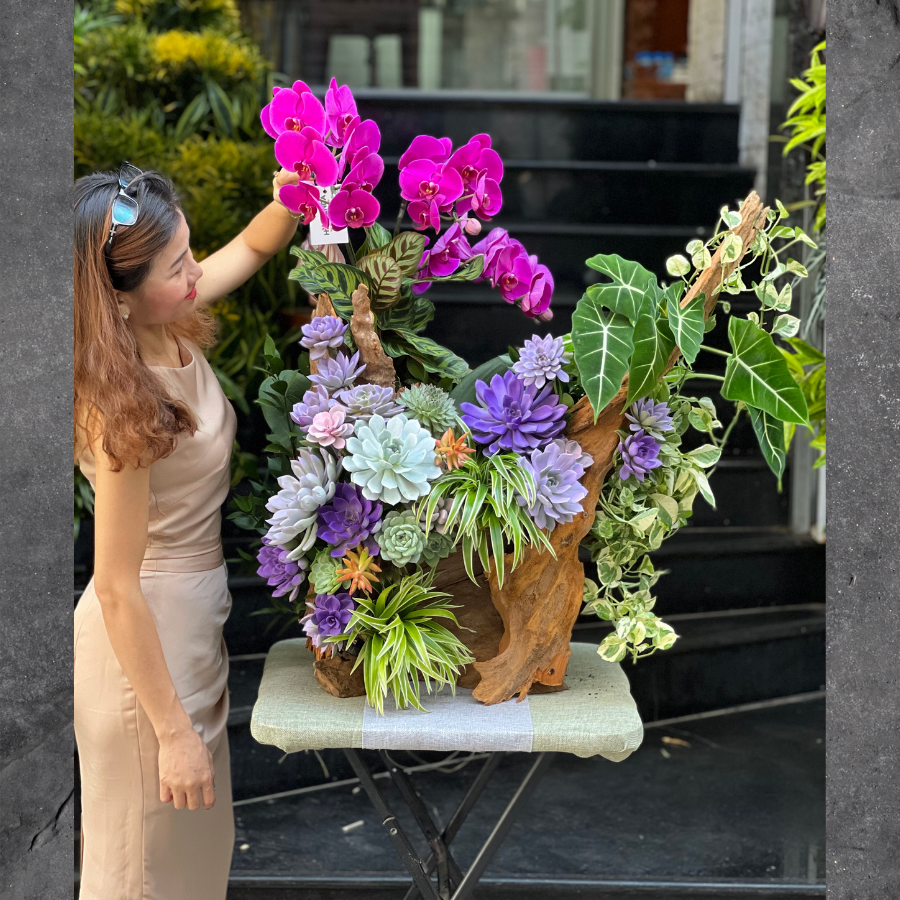 Sen Đá Trồng Gỗ Lũa Mix Lan Hồ Điệp Tím – Hoa Sinh Nhật Độc Đáo, Hoa Khai Trương Hiện Đại