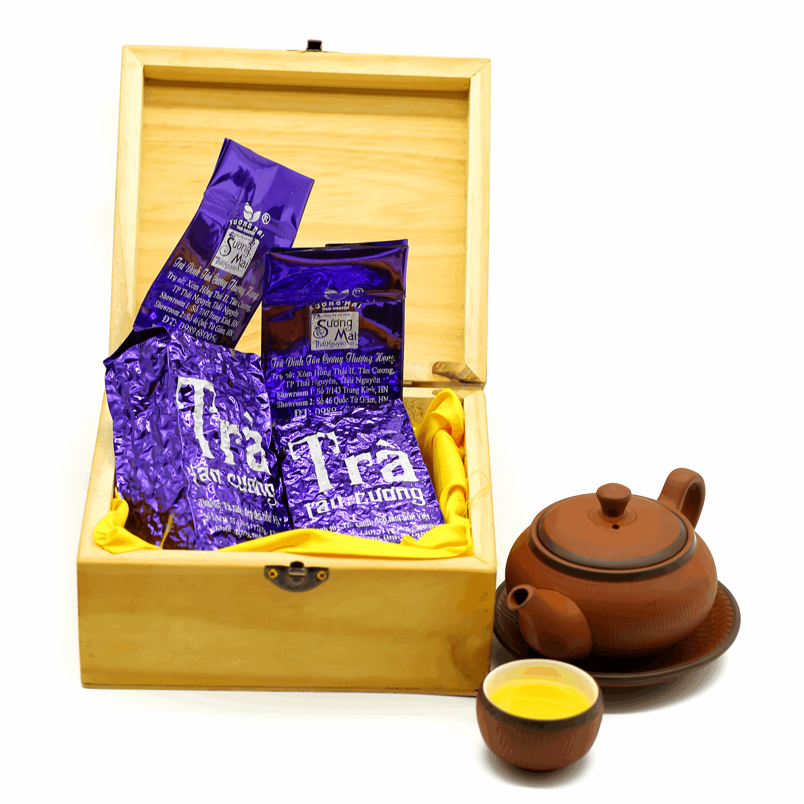 Đóng gói: Sản phẩm được đóng gói hút chân không. Bên trong túi tráng bạc, vỏ ngoài màu tím. Gói trà 100g được đặt trong hộp gỗ, hộp da, chất lượng cao vô cùng sang trọng.