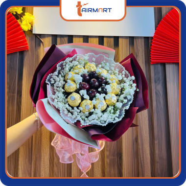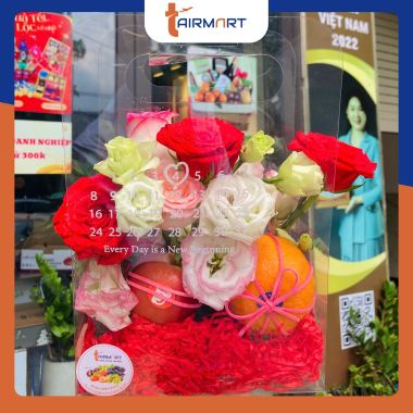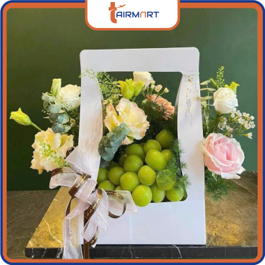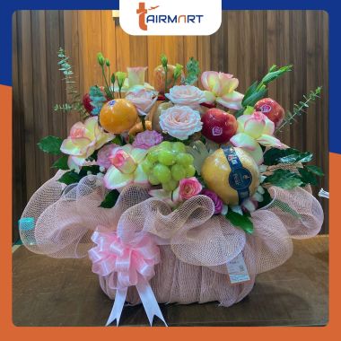 Set quà được kết hợp giữa trái cây tươi nhập khẩu và hoa tươi đi kèm
